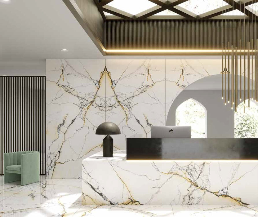 PAUNAZZETTO REALE este o nuanță elegantă de ceramica portelanată cu un fond alb-ivory și venaturi bogate în tonuri de auriu, negru și ruginiu, oferind un aspect deosebit pentru orice bucătărie sau baie. Disponibil în finisaje lucios și mat (natural), acest material premium combină frumusețea cu performanța.