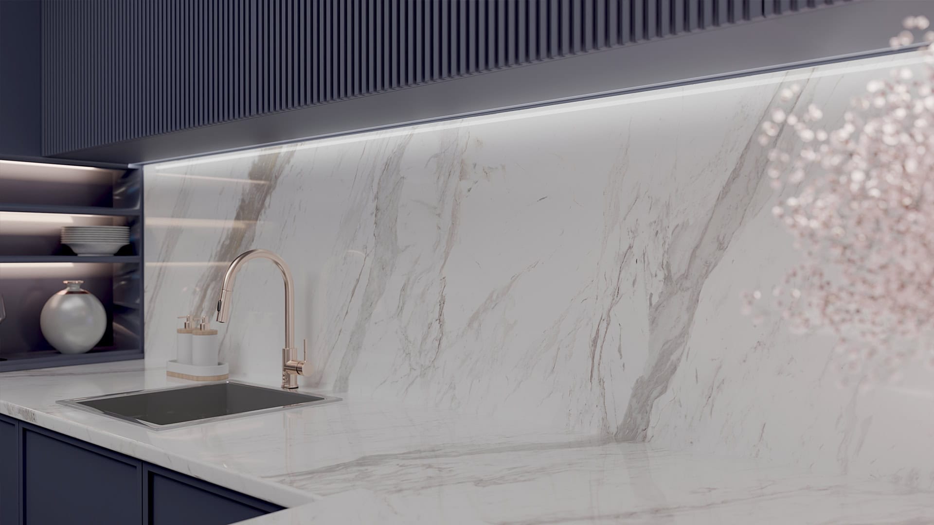 și iluminare LED caldă, care pune în valoare venele fine ale blatului fără a încărca vizual spațiul.