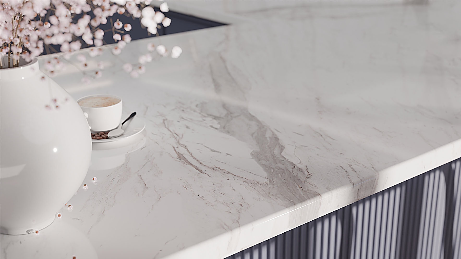 Pentru un ambient echilibrat și sofisticat, Calacatta Nif 2074 se integrează perfect alături de fronturi mate sau satinate, linii curate, electrocasnice încorporate