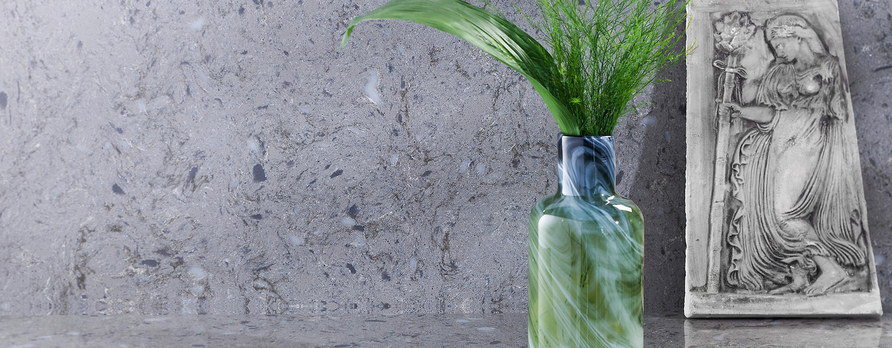 NEMESIS este un quartz compozit cu aspect de granit, de culoare antracit ciment, având o suprafață lucioasă impregnată cu microcristale de oglindă pentru un efect vizual sofisticat.