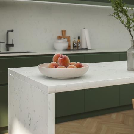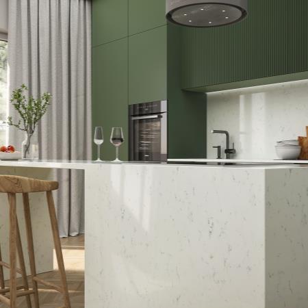 SIERRA WHITE este un model de quartz cu aspect de marmura naturala, care are suprafata cu un fond de culoare alba, impregnata de venaturi subtile de culoare gri. Produs din gama Exclusive, confera un aer sofisticat incaperilor in care este integrata.