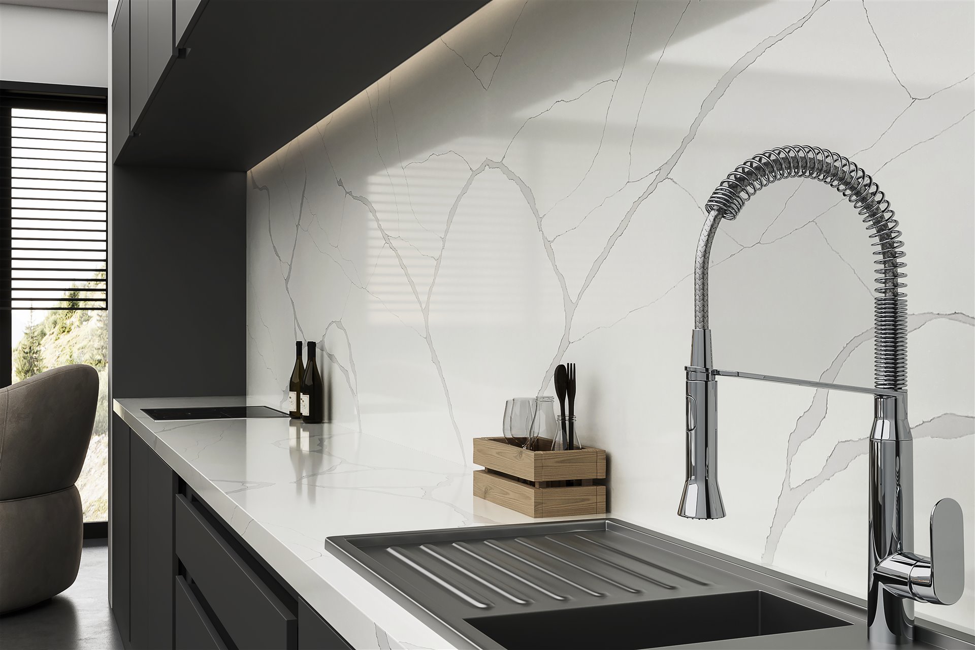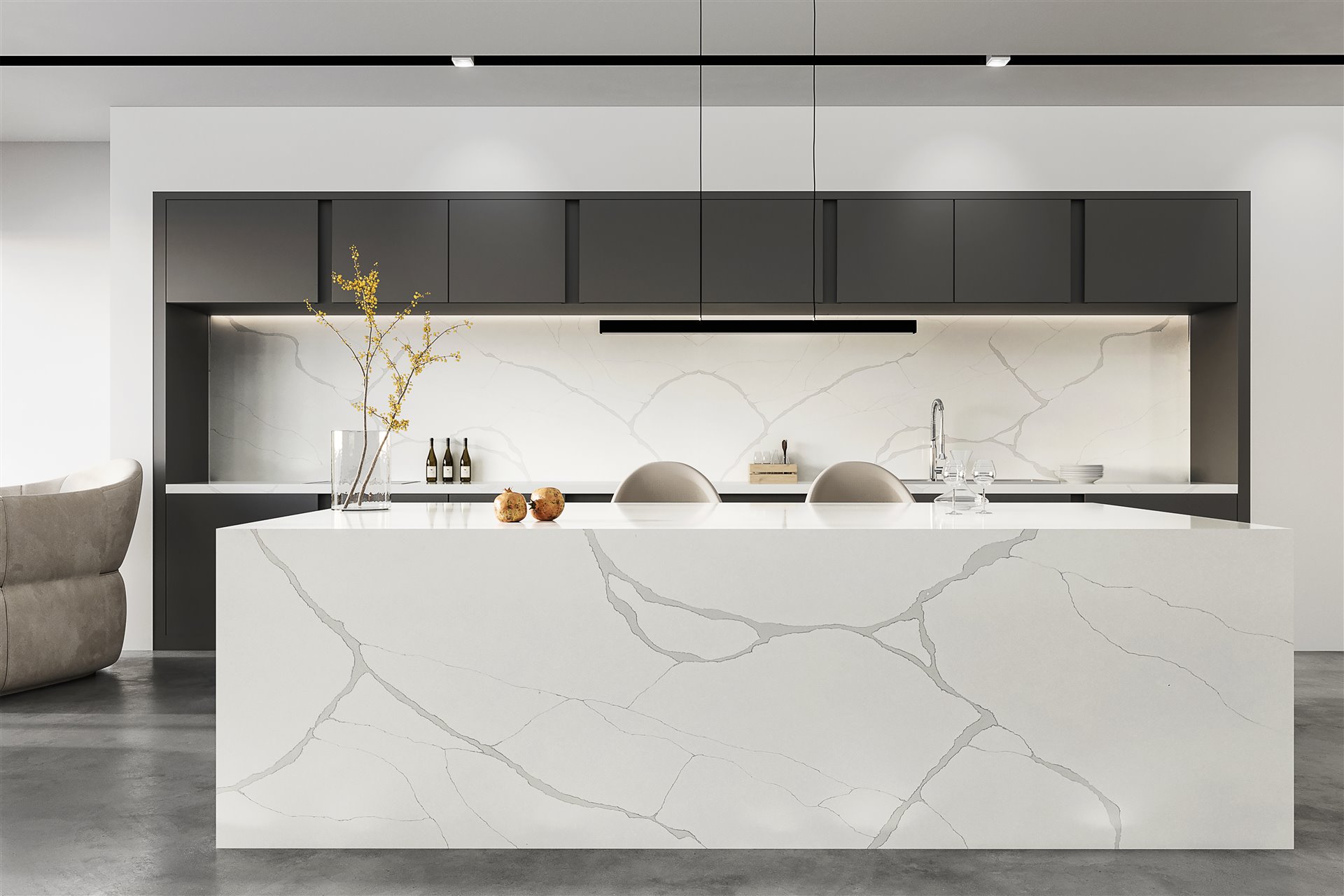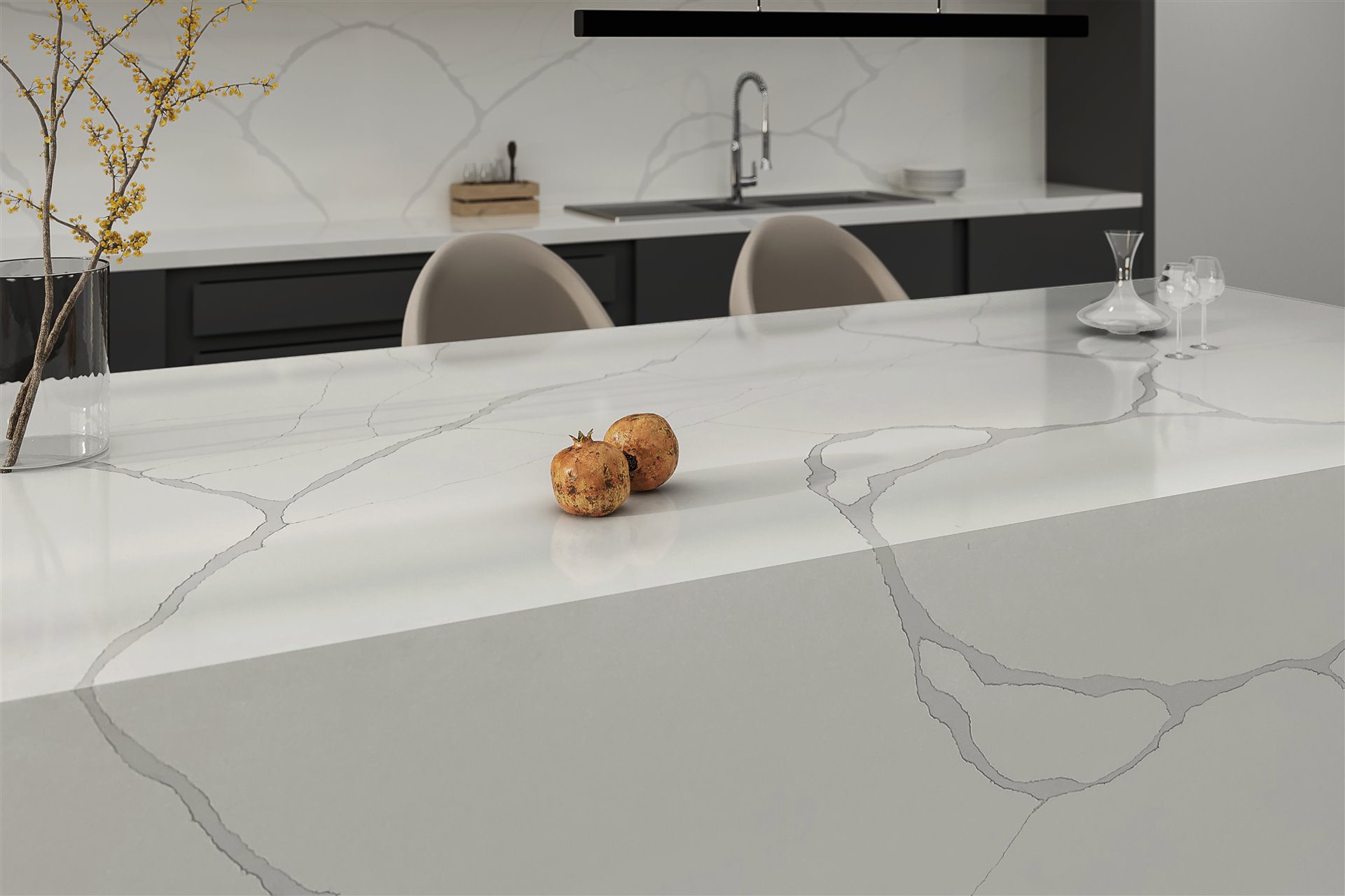 CALACATTA ALDEON este un model de quartz cu aspect de marmura naturala tip calacatta, care are suprafata cu un fond de culoare alba, brazdata de venaturi prelungi de culoare gri. Produs din gama Exclusive, confera eleganta si rafinament bucatariilor si bailor in care este integrat.
