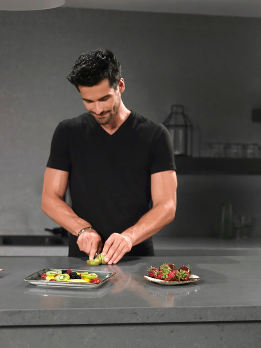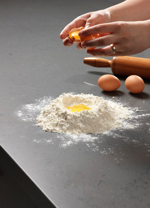 Blaturile de bucătărie din quartz compozit Ares sunt realizate din materialul de înaltă calitate produs de Cimstone, având un aspect marmorat cu un fond gri închis și venaturi gri-antracit. Aceste blaturi aduc un design sofisticat și elegant, fiind perfect adaptate pentru bucătării moderne, băi, restaurante sau chiar pentru utilizare în domeniul medical.