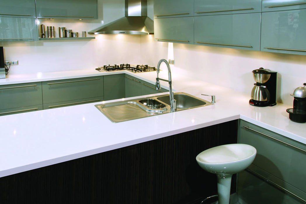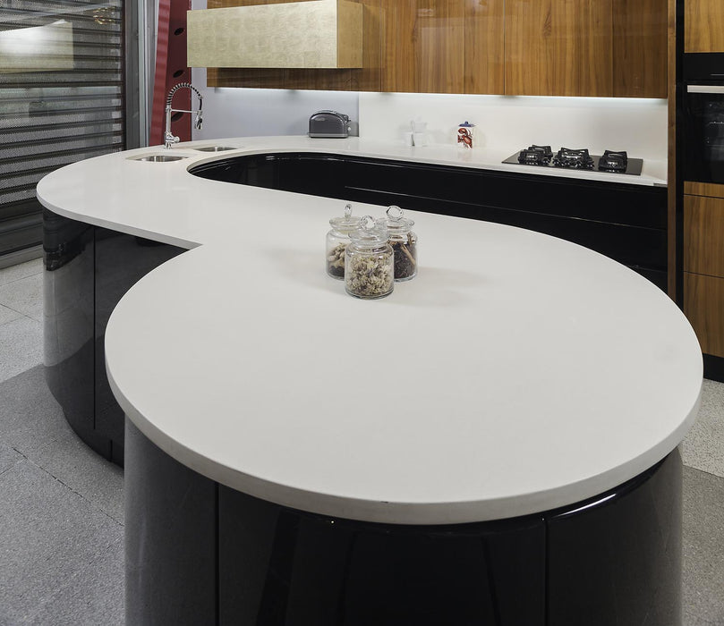 Acest blat premium din quartz compozit Cimstone, cu fond alb uni și suprafață lucioasă, adaugă un aer de eleganță și modernitate oricărui spațiu. Perfect pentru cei care caută atât stil, cât și rezistență.