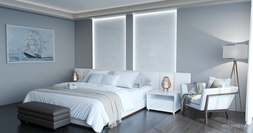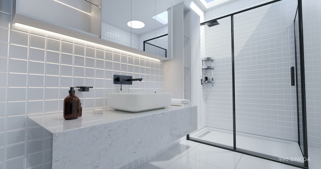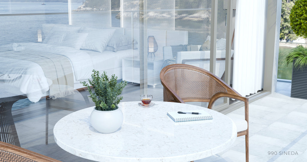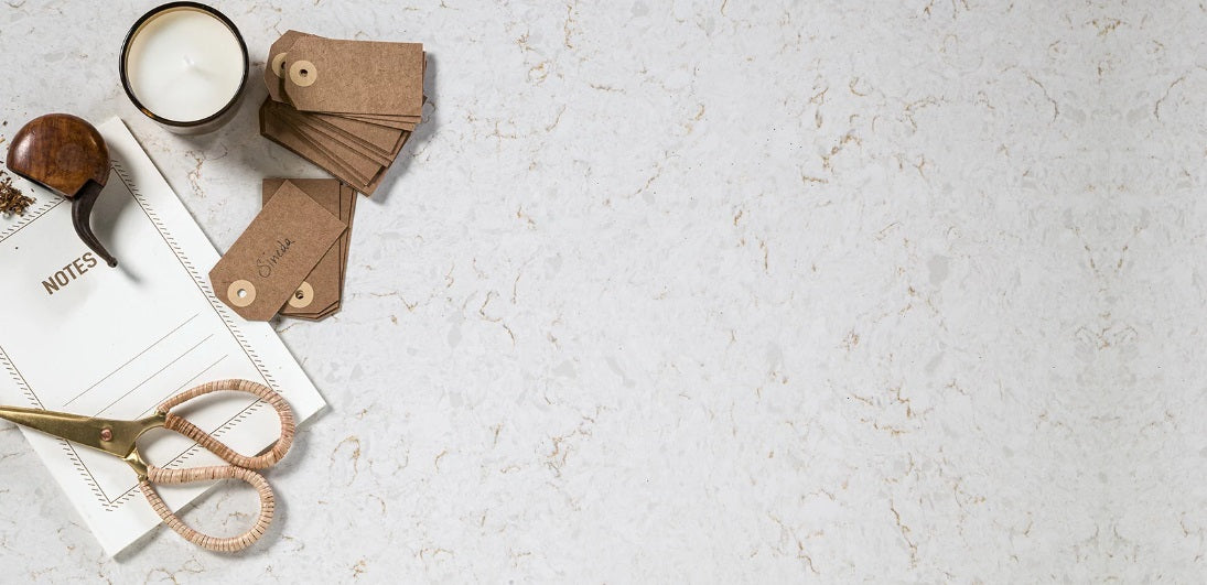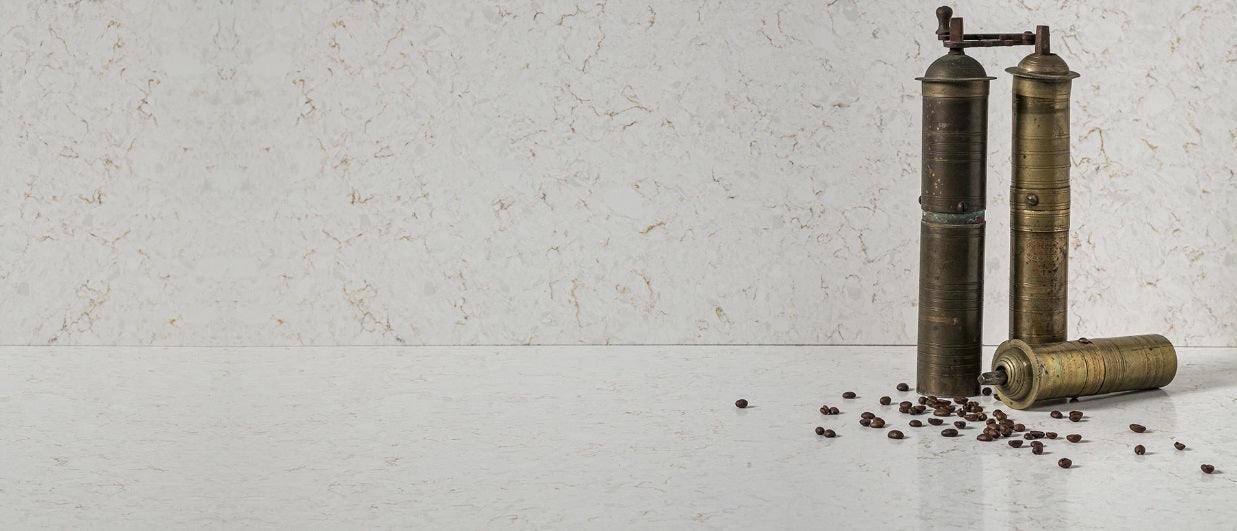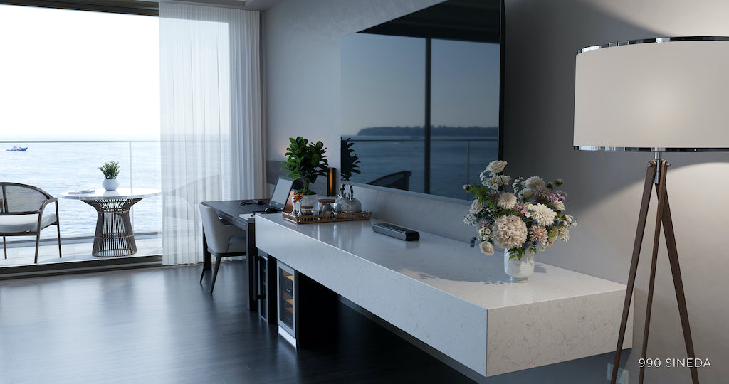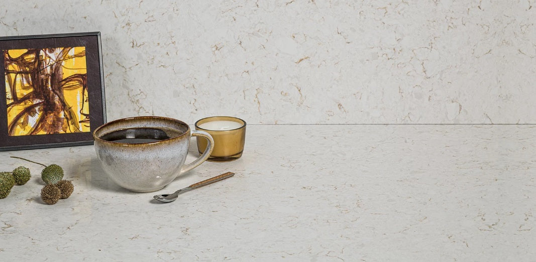Blaturile din quartz compozit 990 SINEDA, brand Cimstone, impresionează prin aspectul lor marmorat, având un fond alb-gălbui și venaturi delicate alb-crem.