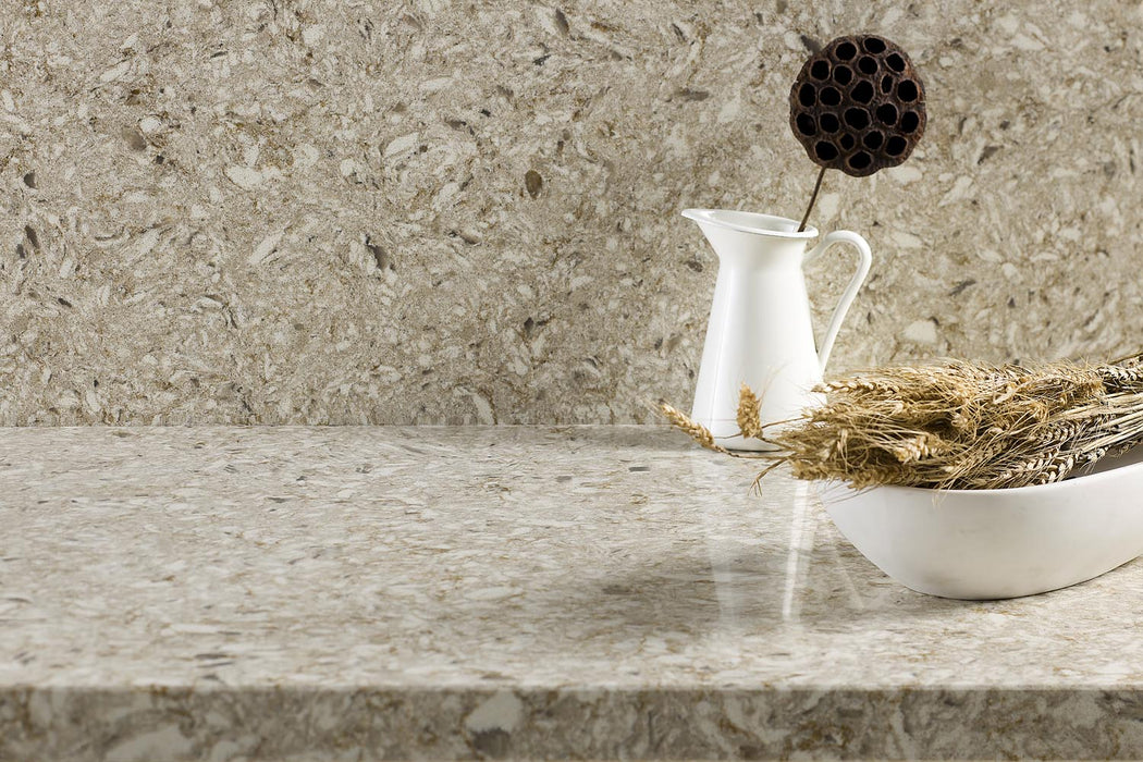 Chakra Beige este un quartz compozit cu aspect de granit, având o suprafață lucioasă într-o nuanță beige, cu particule crem-maro, perfect pentru amenajări elegante și rafinate.