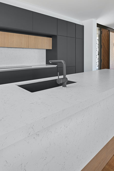 Model cu aspect rafinat de marmură naturală, în nuanță alb-gri cu venaturi antracit, ce adaugă eleganță oricărui spațiu.