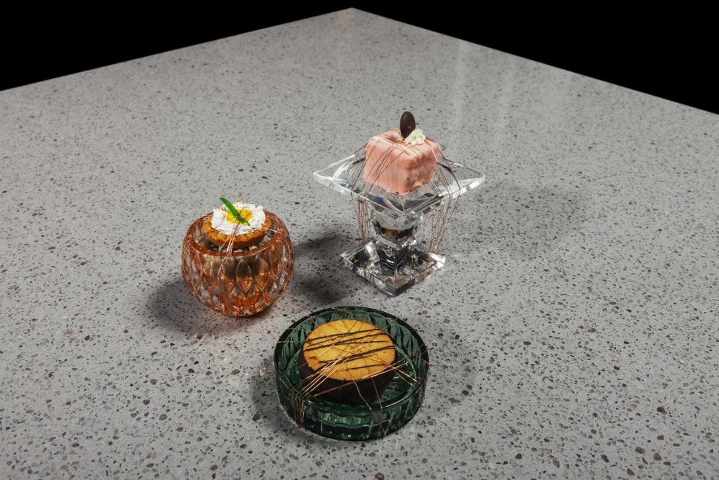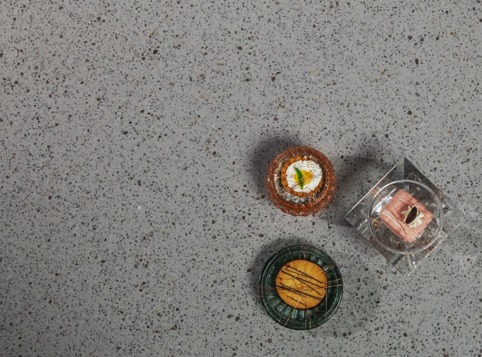 Blaturile de bucătărie Graniglio Grigio din quartz compozit, sunt de culoare gri, cu finisaj lucios și granulare, oferind o alternativă modernă la marmura clasică. Aceste blaturi sunt rezistente la căldură, pete, șocuri și zgârieturi, și sunt ideale pentru bucătării, băi, trepte, mese, dar și pentru domeniul Horeca și medical.